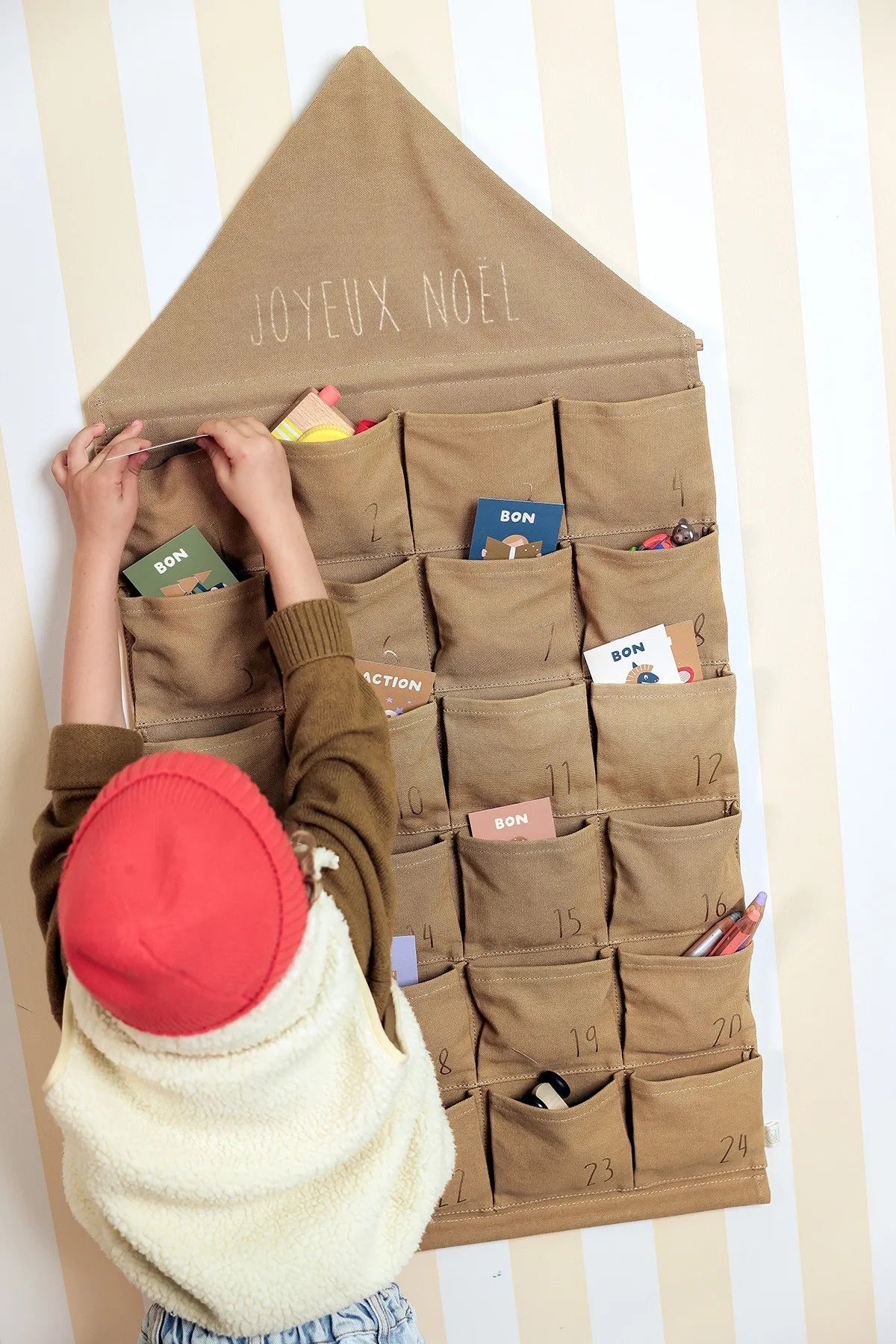 Petit Picotin fait de très jolis calendriers en tissu, réutilisables d'année en année. J'aime beaucoup celui de la marque Ferm Living, qui sera même joli dans votre salon. Et enfin, Sostrene Grene fait des petites maisons en papier très mignonnes qui composent un village de Noël.
